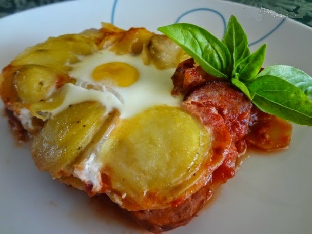 Πάνω από την σάλτσα βάζουμε τις πατάτες και τα λουκάνικα ανακατεμένα